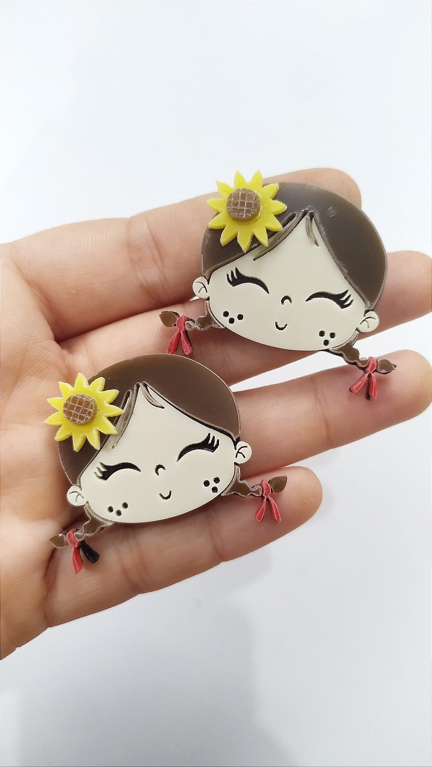Boneca junina cabelo castanho liso girassol acrílico